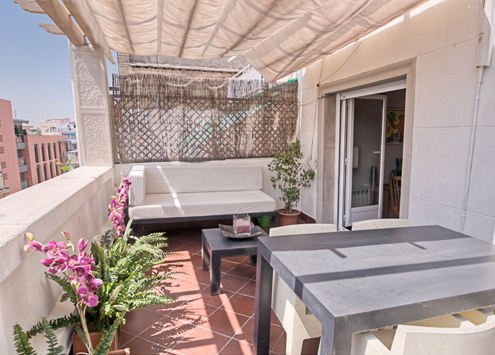 Ático de 75m² y 15 m² de terraza soleada todo el día. Dispone de dos habitaciones y está totalmente equipado. Situado junto a la novelística Plaza del Diamant en el Barrio de Gracia.